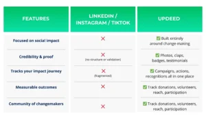 Platforms like LinkedIn and Instagram were built for self-promotion. UPDEED was built for social contribution.